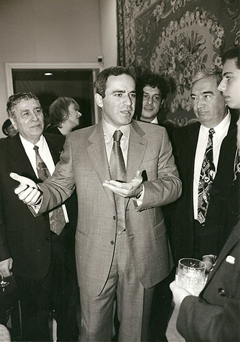 Roman Pelts speaking to Garry Kasparov at a function held by Leslie Dan.